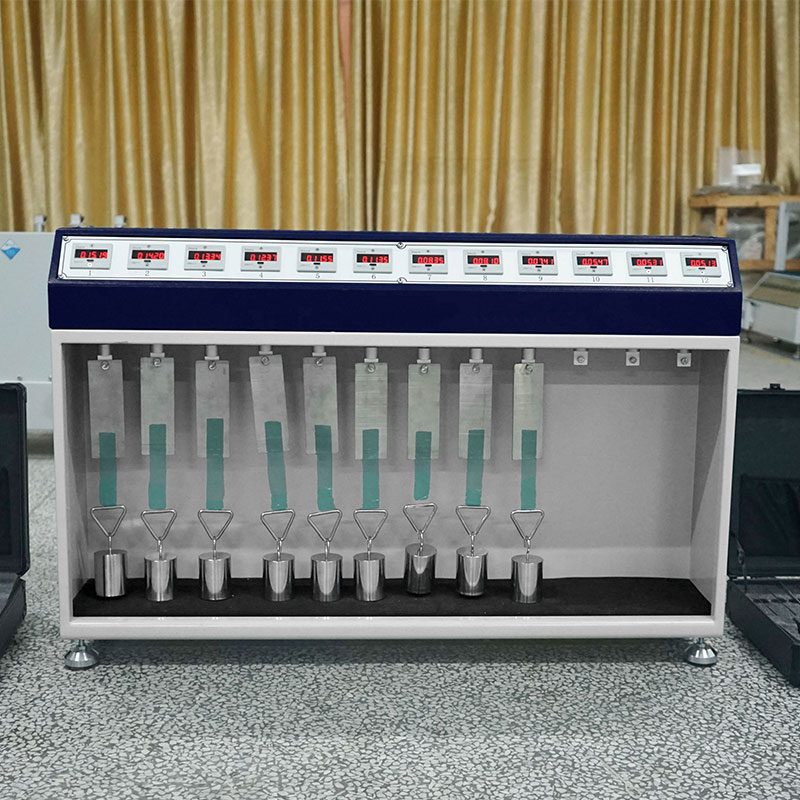 方法A:試樣在裁剪前,先去除最外的3-6層膠帶,裁剪最少3份12mm(或24mm)寬長(zhǎng)約150mm的粘膠帶,試樣解卷后5分鐘內(nèi)粘試在驗(yàn)鋼板上,粘貼面積12×12mm²(或24×24mm²),用2kg±100的標(biāo)準(zhǔn)壓輥以10mm/s的速度來(lái)回輾壓三次,將不銹鋼三角環(huán)扣與試驗(yàn)鋼板對(duì)齊,使試樣自由端綁定在不銹鋼三角環(huán)扣上。試樣準(zhǔn)備好后在1分鐘內(nèi),將鋼板掛于試驗(yàn)儀測(cè)試位上,輕輕掛上砝碼,工位自動(dòng)開(kāi)始計(jì)時(shí),當(dāng)粘膠帶自然脫落后,對(duì)應(yīng)砝碼模組的數(shù)顯累時(shí)器記錄保持時(shí)間,測(cè)試結(jié)束,人工記錄數(shù)據(jù)并綜合數(shù)據(jù)評(píng)定膠帶粘合的持粘性。