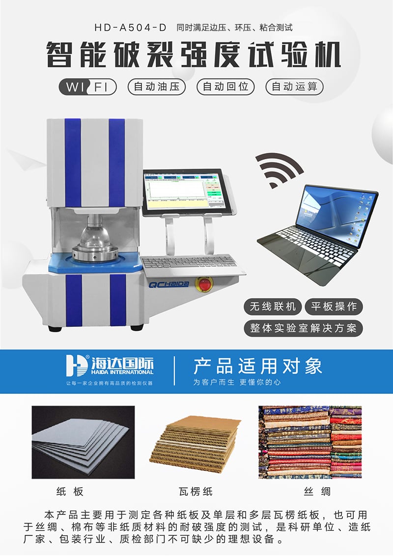 二、破裂試驗(yàn)機(jī)產(chǎn)品介紹:紙張破裂試驗(yàn)機(jī)是國(guó)際通用型繆綸(Mullen)式儀器是紙和紙板強(qiáng)度性能檢測(cè)的基本儀器,主要用于測(cè)定各種紙板及單層和多層瓦楞紙板,也可用于絲綢、棉布等非紙質(zhì)材料的耐破強(qiáng)度的測(cè)試。本儀器操作簡(jiǎn)單、性能可靠、技術(shù)先進(jìn),是科研單位、造紙廠家、包裝行業(yè)、質(zhì)檢部門(mén)不可缺少的理想設(shè)備。